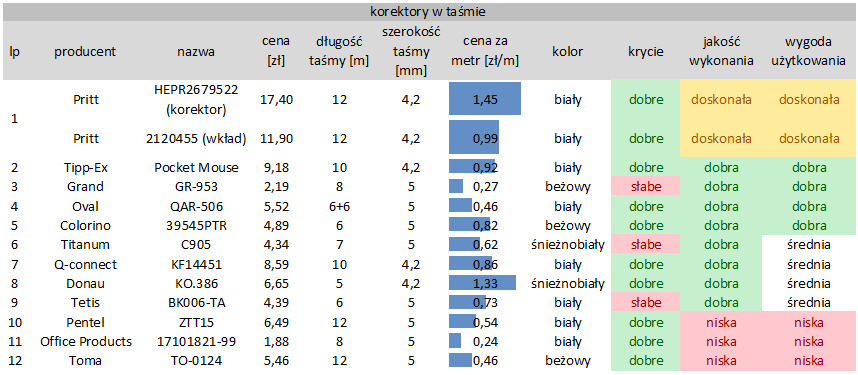 Według mojego rankingu najlepszy korektor w taśmie to korektor Pritt HEPR2679522. Jest też zdecydowanie najdroższy ze wszytkich, choć gdy bierzemy pod uwagę cenę wymiennego wkładu, to cena zbliża się do drugiego najlepszego korektora w taśmie – Tipp-Ex Pocket Mouse. Jednak Trzecie miejsce w rankingu zajmuje niemalże najtańszy korektor – Grand GR-953, który okazał się wygodny, poręczny i dobrze wykonany. Co prawda ma słabe krycie, ale zupełnie wystarczające, aby spełniał swoją funkcję. Czwarte miejsce zajmuje korektor Oval QAR-506 ze względu na przystępną cenę i względną wygodę użytkowania. Piąte miejsce to korektor Colorino 39545PTR, który jest najbardziej kompaktowy ze wszystkich, ale jest wyraźnie droższy od dwóch poprzednich pozycji i mniej ekologiczny.